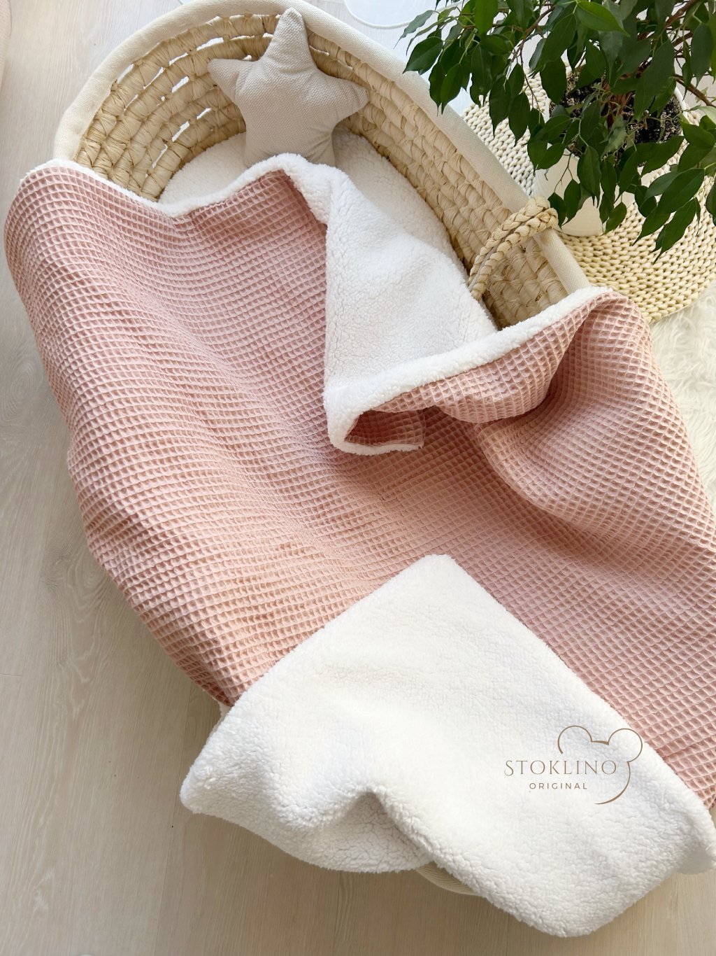 Dečka je šitá z plyšového beránka, která děťátko krásně zahřeje a bavlněné vafloviny ve starorůžové barvičce.