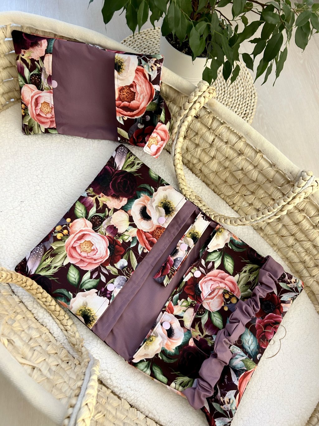 Vnitřek plenkovníku obsahuje pět kapes a jedno poutko se zapínáním na druk, které slouží k připnutí plenkovníku ke kočárku nebo k připnutí dudlíku.
