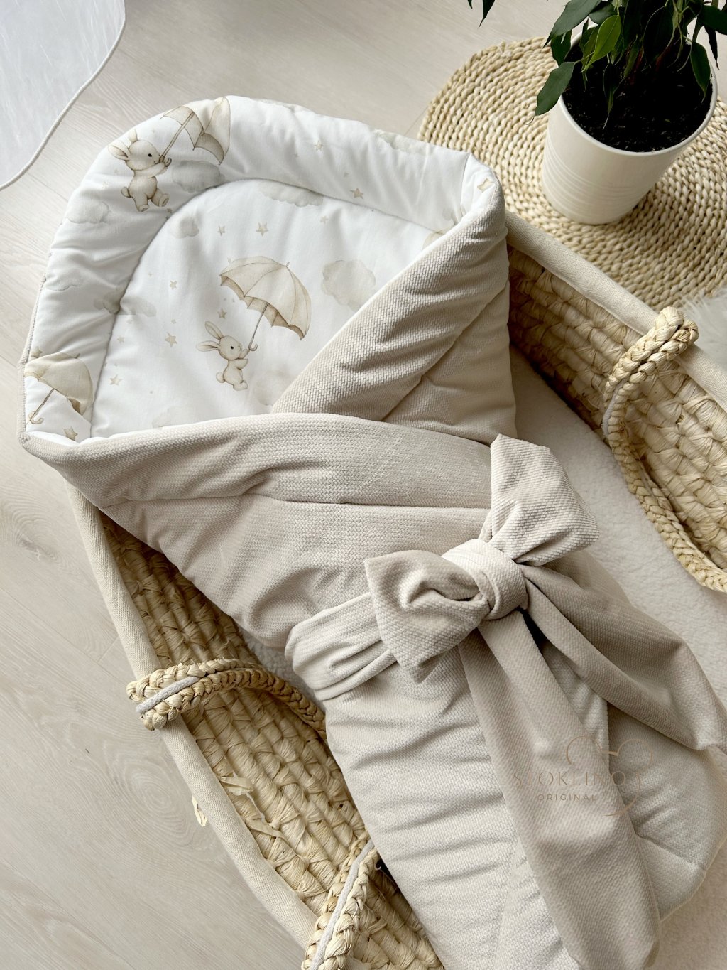 Set do postýlky zahrnuje hnízdečko a zavinovačku s mašlí. Set je ve sladěných přírodních barvách v materiálu prémiové bavlny s králíčky a pískovém sametovém velvetu. Celá výbavička je oboustranná.