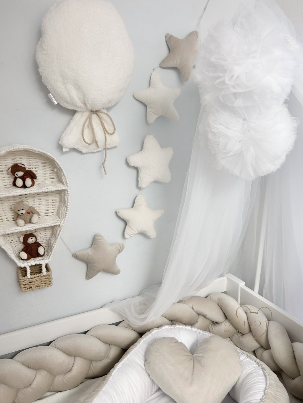 Set do postýlky 7v1 zahrnuje hnízdečko, zavinovačku s mašlí, copánkový mantinel 180 cm a pro doplnění a zútulnění navíc dekorační nebesa nad postýlku včetně stojanu, dekorační polštářek srdíčko, dekorační balónek na zeď a hvězdičkovou girlandu. Vše ve sladěném odstínu sametového velvetu, plyšového beránka a saténové bavlny bílé. Celá výbavička je oboustranná.
