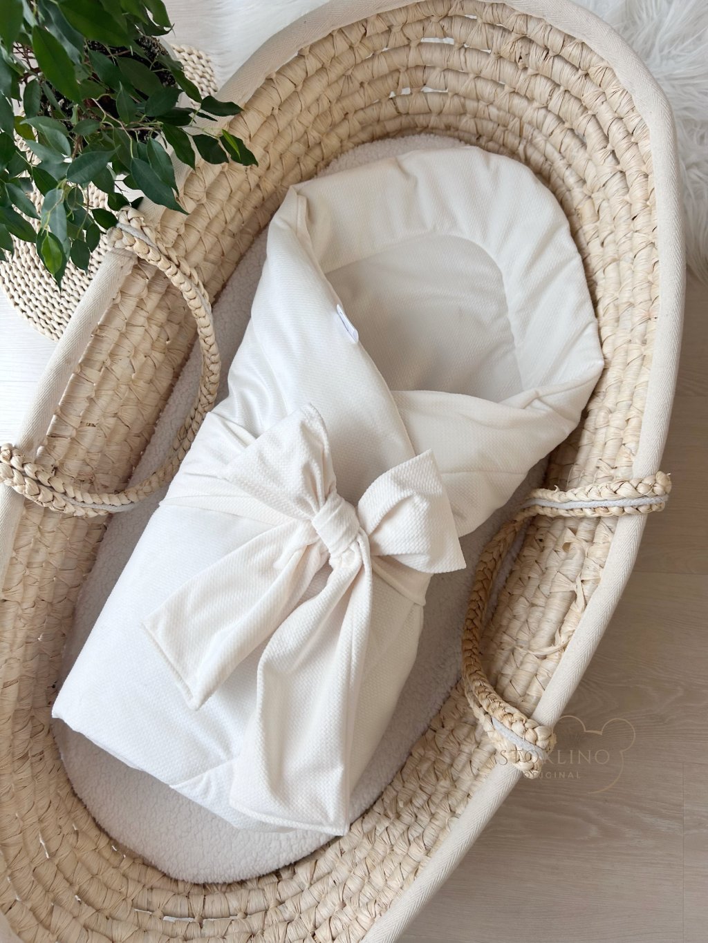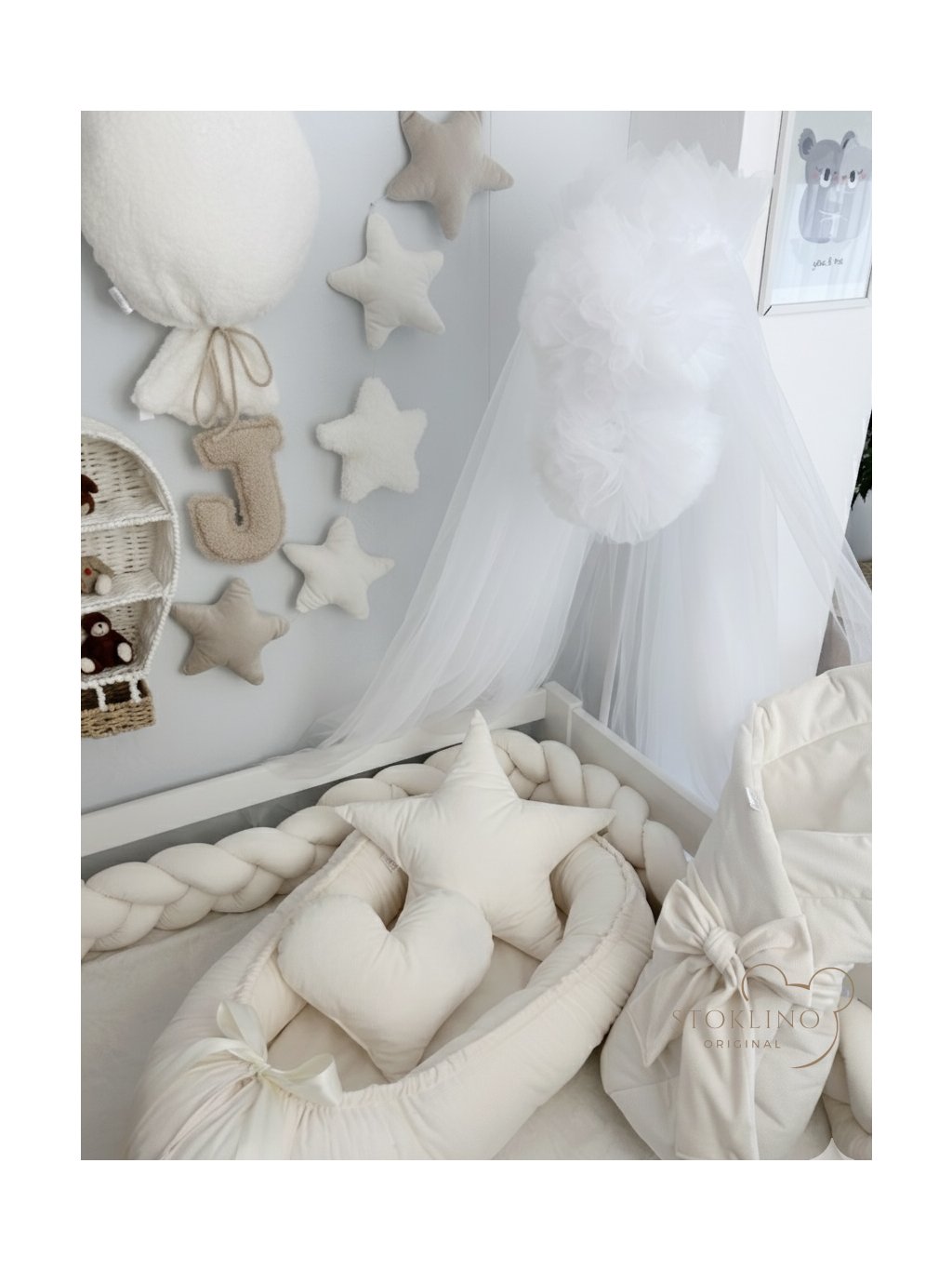 Set do postýlky 8v1 zahrnuje hnízdečko, zavinovačku s mašlí, copánkový mantinel 180 cm a pro doplnění a zútulnění navíc dekorační nebesa nad postýlku včetně stojanu, dekorační polštářek srdíčko a hvězdičku, dekorační balónek na zeď a hvězdičkovou girlandu. Vše ve sladěném odstínu sametového velvetu a plyšového beránka. Celá výbavička je oboustranná.