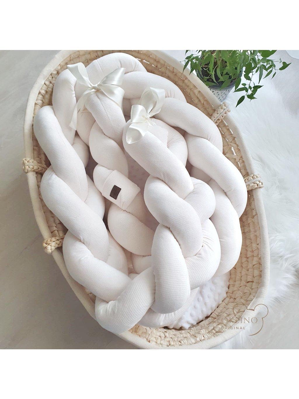 Copánek má na koncích všité stuhy, aby se dal přivázat k postýlce. Délka mantinelu je 180 cm.