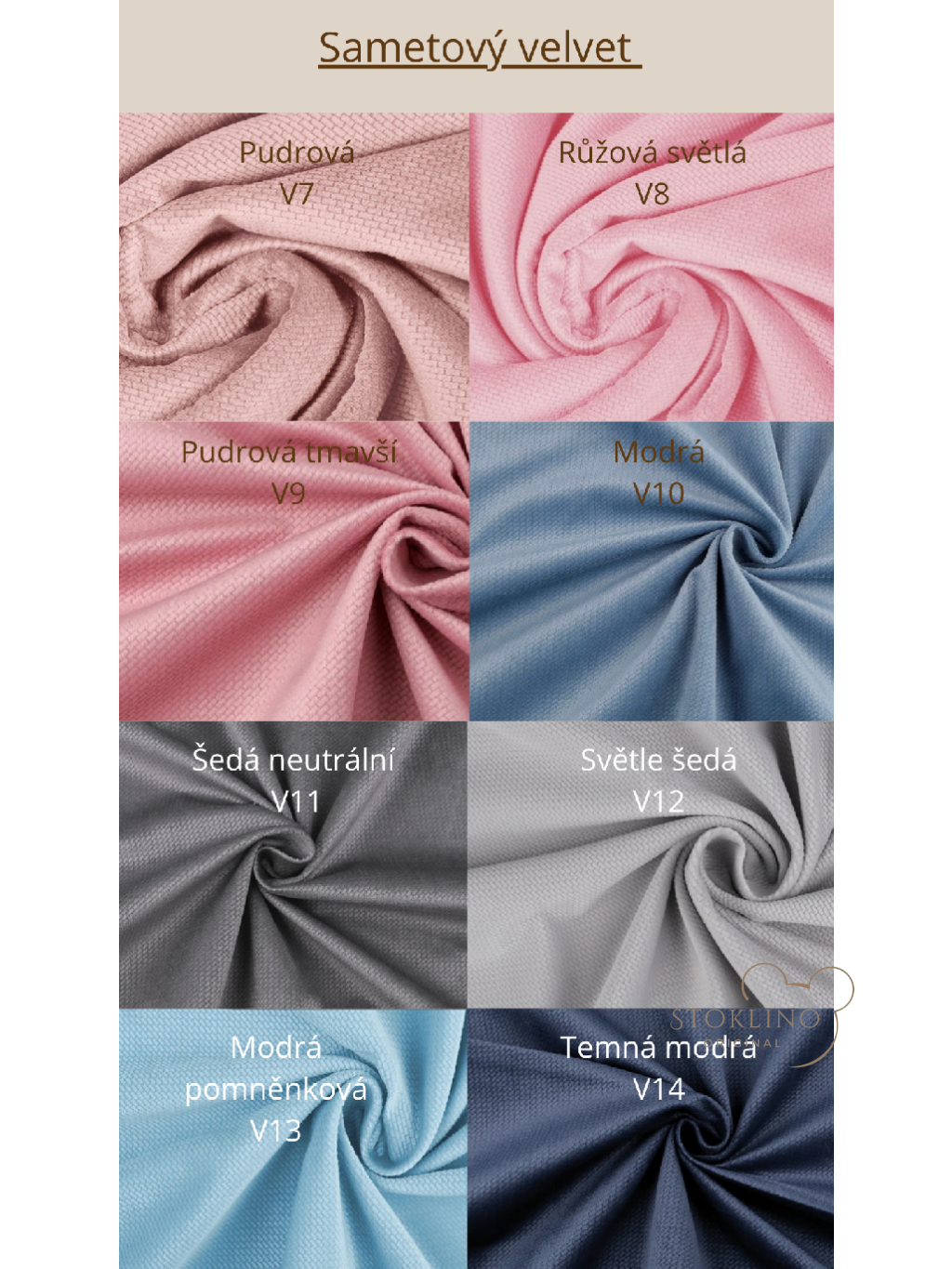Odstín sametového velvetu lze změnit! Odstíny, ve kterém si přejete výbavičku nebo jednotlivé výrobky ušít napište, prosím, do poznámky v košíku v posledním kroku objednávky. (např. zavinovačka pudrový velvet V7, hnízdečko šedý V12 a podobně). Pokud do poznámky odstín velvetu nenapíšete, ušiji Vám výbavičku podle úvodní fotky, tedy v kombinaci s krémovým velvetem V3.